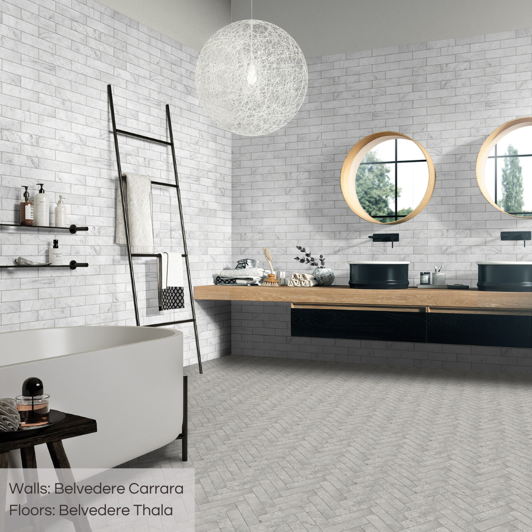 - Belvedere is a 2×8 natural stone tile that highlights the character and variation only real marbles and limestones can offer. Each piece has subtle movement, softly pillowed edges, and natural texture that bring depth and warmth to walls. Available in Marquina, Perlino, Carrara, Travertine, and Thala, Belvedere works beautifully in kitchens, bathrooms, and feature walls, adding an authentic look that holds its appeal year after year.