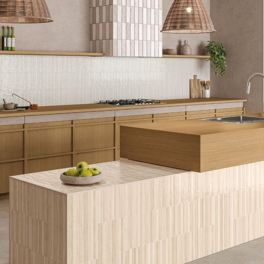 - Tempo is a kit-kat style ceramic tile that adds texture and movement without overpowering a space. This Spanish tile features slim fluted lines that catch light beautifully and gentle shade variation. Available in White, Ecru, Ocean, Mint, and Green, Tempo works very well in showers and on kitchen backsplashes.