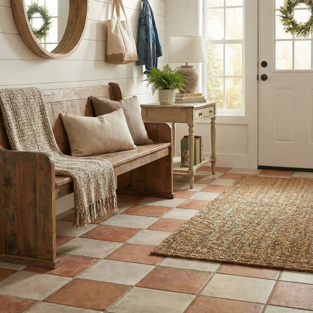 - Our Tuscan line features rustic porcelain tiles inspired by sun-washed Mediterranean countrysides and Italian farmhouses. Subtle texture and natural shade variation give each piece warm character that feels artisanal rather than manufactured. Designed for both floors and walls, Tuscan brings an easy, grounded look to kitchens, entryways, and outdoor-inspired interiors. Available in Light, Cotto, and Dark, the collection also includes three versatile shapes: a 9″ hexagon, 2.5" × 8" brick (which is excellent for herringbone floors), and an 8" × 8" calibrated square that can also be used in a rustic checkerboard.